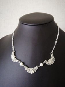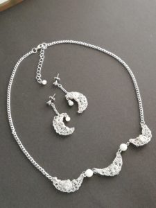 ワイヤークロッシェの三日月ネックレス! 投稿日: 2021年4月19日 投稿者: nova-tricotage 昨日は 何だか肌寒く 季節が逆戻りしたようでした・・・ なんと 台風も接近しているとか( ゚Д゚) 今日は 暖かく穏やかなおてんきになるようで ほっとしてます。(*^^*) 今回は 出来立ての新作です。 ワイヤークロッシェの三日月パーツで仕上げた 『三日月ネックレス』!! 気軽に身に着けていただけるネックレスです。 おそろいの イヤリング(ピアス)も 創りました。 Nova Tricotage (ノーヴァトリコタージュ)