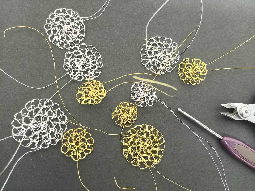 silverとgoldのwireを使って サークルパーツをいくつも編んでいます。